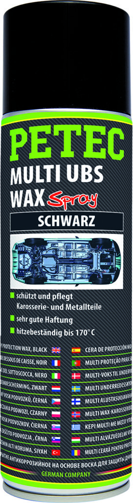 PETEC Multi UBS-Wax auf Wachsbasis bietet optimalen Korrosions- und Steinschlagschutz in korrosionsgefährdeten Bereichen und haftet auf vielen Oberflächen. Durch die hervorragende Kriechfähigkeit erreicht Multi UBS-Wax auch schwer zugängliche Karosseriehohlräume.